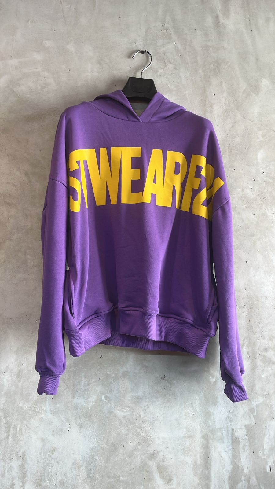 buzo morado con letrero amarillo